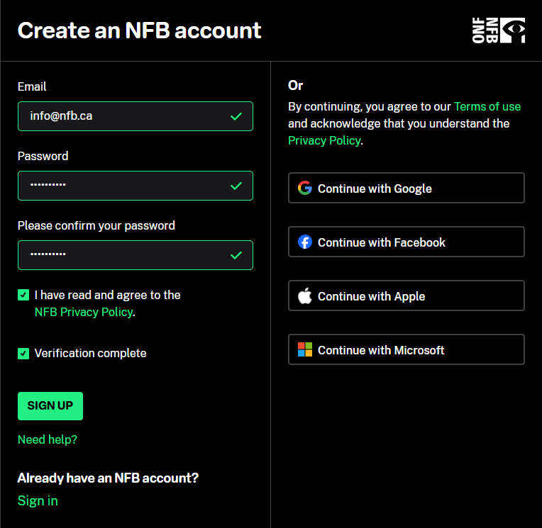 To create an NFB.ca account, simply click on the “Create your NFB account” button at the bottom of the Sign in page or go to the following address:
